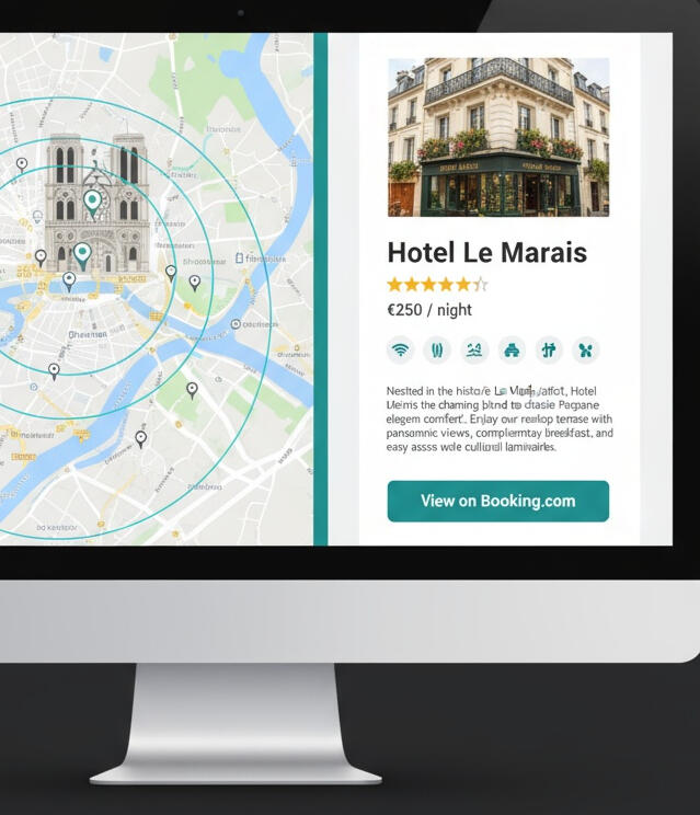 Hotels, apartments—we show you everything within your chosen area, from multiple booking platforms.
